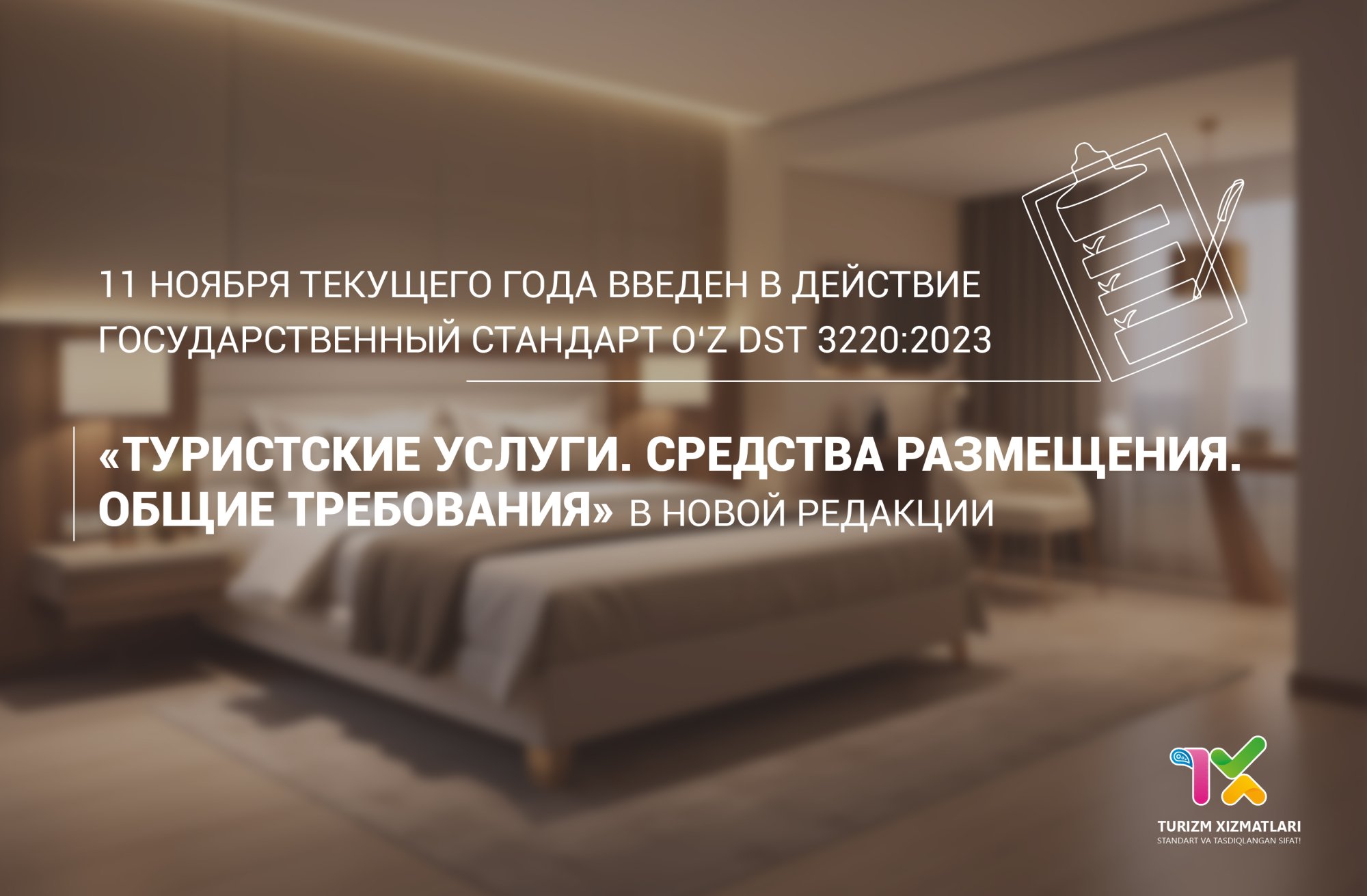 7 июля 2023 года в соответствии с действующим законодательством, пройдя согласования с компетентными министерствами и ведомствами принят новый стандарт O‘z DSt 3220:2023 «Туристские услуги. Средства размещения. Общие требования». Он вступил в силу 11 ноября текущего года.